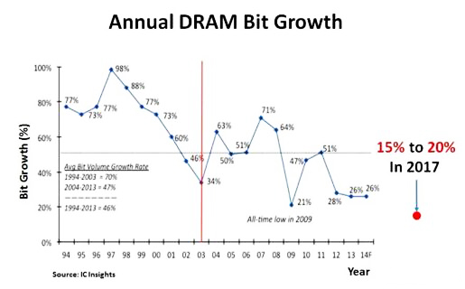 美光(Micron)表示,2017年DRAM供給位元預(yù)計(jì)成長(zhǎng)15-20%,可說(shuō)是近20年來(lái)最低的位元成長(zhǎng)率(bit growth)。如此低的位元成長(zhǎng)率,主要是因?yàn)镈RAM微縮限制。市場(chǎng)上有很長(zhǎng)一段時(shí)間都沒(méi)有任何有關(guān)DRAM微縮的消息了。當(dāng)供給位元成長(zhǎng)低于45%時(shí),這時(shí)就是賣(mài)方的市場(chǎng)了。因此,DRAM的寡頭壟斷、低位元成長(zhǎng)率,以及制造擴(kuò)張遲緩,導(dǎo)致長(zhǎng)期的供應(yīng)吃緊。最終的局面可能就是DRAM的價(jià)格不斷上漲,而供應(yīng)面卻不會(huì)有任何改變。